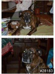 Cão de porte grande castanho e preto. Branco no peito e pontas das patas. Focinho castanho e preto. Branco junto do nariz. Não tem cauda (cortada).