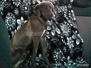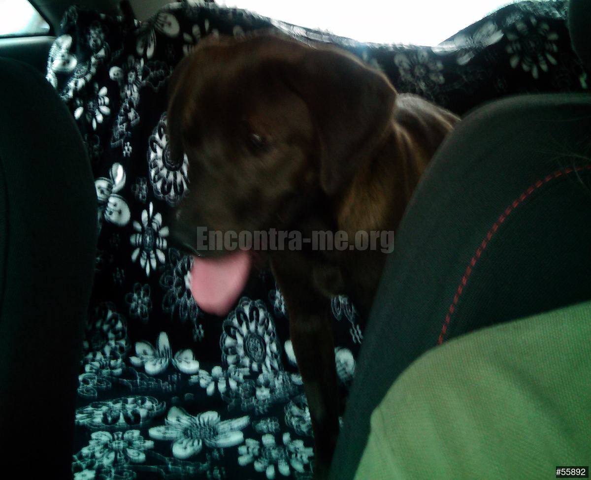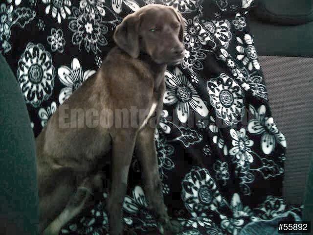 Castanho escuro QUASE PRETO com mancha branca no peito. Orelhas caídas. Focinho tipo Labrador. Corpo magro, esguio.