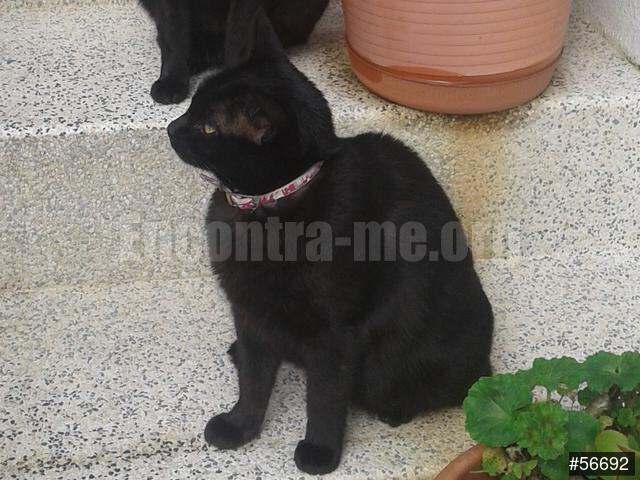 Gatinha toda preta. Falta-lhe um canino.